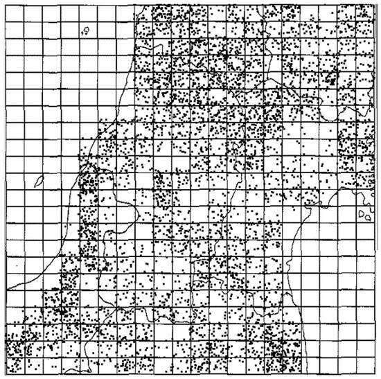 The hourly measurement values of each point in the Tohoku region, which are necessary for data analyses, were taken from the values published on the website. The number of cedar pollen grains at each location is shown in pie chart form as a logarithmic value based on the Weber–Fechner law. The data for the wind direction, wind speed, and temperature were published on the website of the Japan Meteorological Agency (The past weather data search screen is displayed here https://www.data.jma.go.jp/stats/etrn/index.php) accessed on 31 May 2025. We obtained the location coordinates of each measurement point in the Tohoku region, which made it possible to display the cedar pollen measurement values, wind direction, and wind speed values on a map. We used Python 3.8 to display on a map the amount of cedar pollen in the air, along with data for the wind direction and wind speed. We used Adobe Photoshop to paste the weather chart, based on the chart published by the Japan Weather Association (Current weather chart provided by the Japan Weather Association (Japanese) https://tenki.jp/guide/chart accessed on 31 May 2025 View past weather charts and calendars going back to 2015). The distribution map of cedar forests in the southern Tohoku region (dotted area in Figure 1) shown in Figure 2 was created using TM images from the Landsat satellite [16]. To create this distribution map, we first walked around the cedar forests that we would use as training areas, and then used the areas to extract satellite data. Thirty years have passed since the image was created, although deforestation has not progressed in Japan, especially in our region. One reason for this is that cedars are not consumed as lumber due to competition from imported timber. The second reason is that even if trees are cut down, they are replanted in the same place to prevent an increase in carbon dioxide caused by global warming and for disaster prevention purposes. Therefore, although a long time has passed since the image was created, cedar forests are distributed mainly in the same areas. Due to the social problem of cedar pollen allergy, there has been a recent movement to cut down trees and plant different species, although this movement has not yet occurred in Tohoku region, as large cities such as the Tokyo metropolitan area have taken the lead.