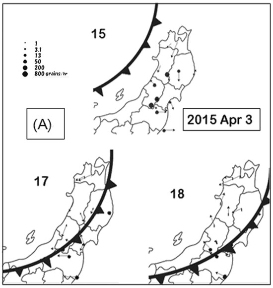 From the perspective of providing information to people in Japan who may be impacted by high levels of pollen, it is necessary that warnings about the abovementioned phenomena be given through weather forecasts on days when a cold front is expected to pass, or when a warm front is expected to move from the south to the north of the Japanese archipelago. In the case of a cold front, the time it takes to pass is about 10 h. There is a possibility that pollen will be dispersed for a few hours after the front passes until, after about 5 h, it is no longer dispersed. In the case of a warm front, the amount of dispersed cedar pollen increases during times when the front does not pass populated areas, so it is necessary to provide information early. In the Tohoku region, for instance, the number of pollen grains released will increase as soon as the warm front reaches the Hokuriku and Kanto regions.