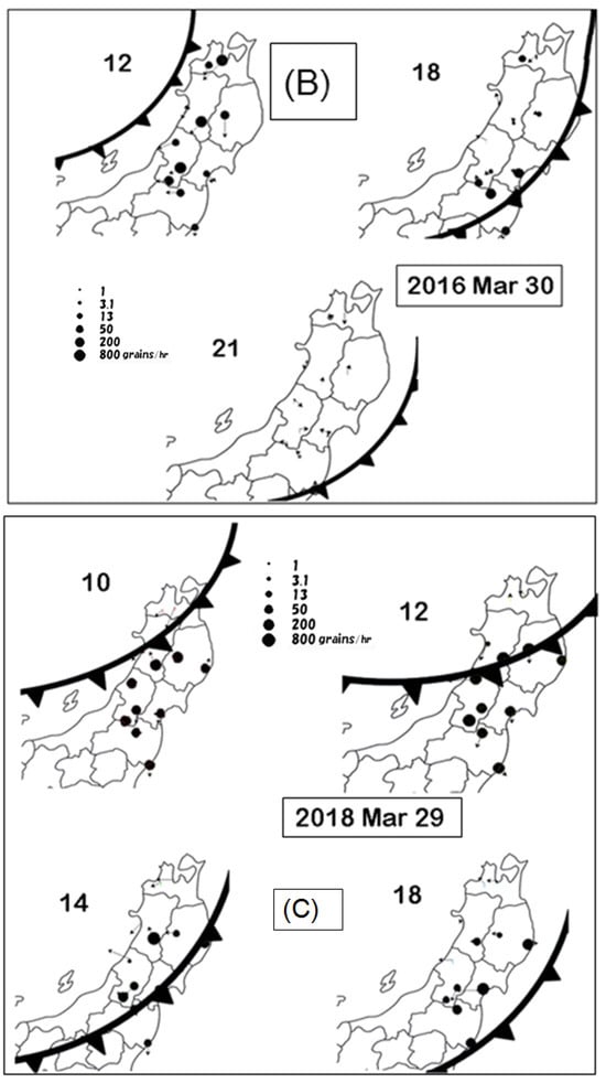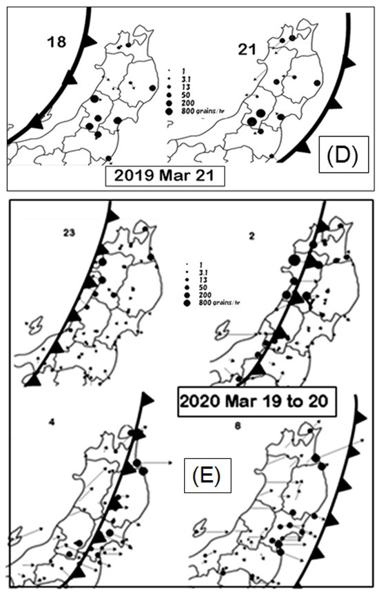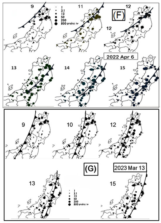 The results of the study for the 10-year period from 2015 to 2024 are shown in Table 1a. In 7 out of the 10 years, a cold front passed through the Tohoku region on the day with the highest pollen count. In the remaining 3 years, no cold front passed through the Tohoku region, although a warm front or stationary front passed through. The details of these three years are shown in Table 1b. Figure 3A–G shows the position of the cold front and the cedar pollen counts at each survey site. The cedar pollen counts at each location are shown in pie chart form, in which the logarithm of the pollen count is the diameter of the circle. It often takes about 3 to 10 h for a cold front to move across the Tohoku region from the Sea of Japan side to the Pacific Ocean side, although sometimes this passage takes just a few hours, as on 3 April 2015 (Figure 3A) and 21 March 2019 (Figure 3D). A large numbers of pollen grains were counted in the western parts of the Tohoku region when the front was still in the Sea of Japan and had not yet reached the Japanese archipelago. In any year, cedar pollen counts can be found in large numbers where the front is located and before and after it has passed through each observation point. A lot of cedar pollen is dispersed in the front surface of a front. In such instances, pollen continues to disperse for several hours after the front passes, although as time passes and the front moves away, it stops dispersing.
