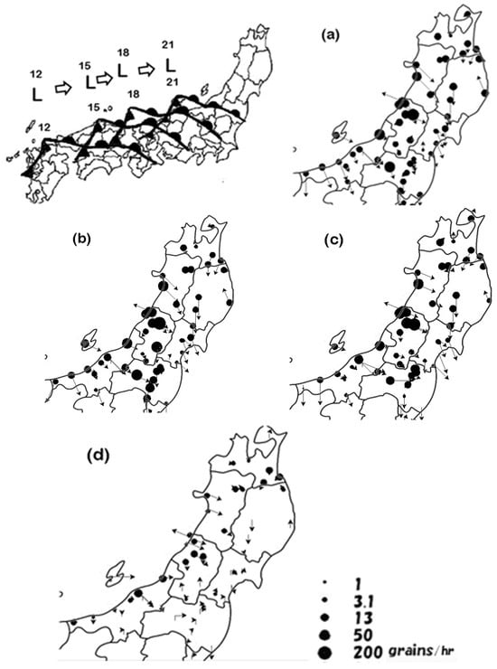 Figure 4 shows the results for 2023. As the Pollen Robo is improved every year, we used new data. Similar results were obtained in 2022. Namely, a low-pressure system located south of Japan gradually moved northward, reaching as far north as the Tohoku region. The warm front dispersed large amounts of cedar pollen at distances from several hundred to one thousand kilometers ahead in its direction of travel (Figure 4a,c). Subsequently, the amounts of dispersed pollen decreased with time (Figure 4d).