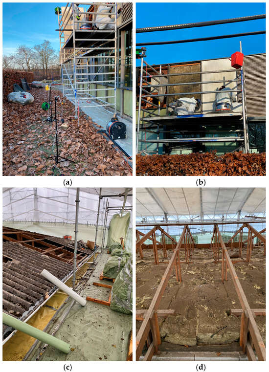 Measuring set up and conditions during removal of facade panels (a,b) and roofing sheets and underlying insulation (c,d). (a) Stationary samples during the removal of facade panels. (b) Personal samples conducted on workers during the removal of facade panels with underlying insulation. (c) Working area during the removal of roofing sheets. The roofing plates covered with moss. (d) A large amount of asbestos-containing dust on the top of the insulation after removing the roof.