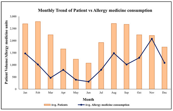 Holoptelea integrifolia pollen as a primary allergen. Patient visit data and medicine issuance records were analyzed to evaluate seasonal co-trends using descriptive time-series and statistical tests, including Pearson correlation and Mann–Whitney U. The analysis revealed consistent peaks in both patient visit and medicine issuance during February–April, corresponding with