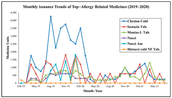 17]. November and December surges (e.g., Dexona Inj, Montas-L Kid, antihistamines) suggest winter-related triggers like cold air and increased particulate matter in ambient air.