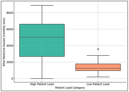 To further investigate this relationship, a Mann–Whitney U test was conducted to compare medicine issuance in high- versus low-patient months, defined as above or below the median patient visits. High-patient months had a mean medicine issuance of 4585 units, compared to 1516 units in low-patient months (see