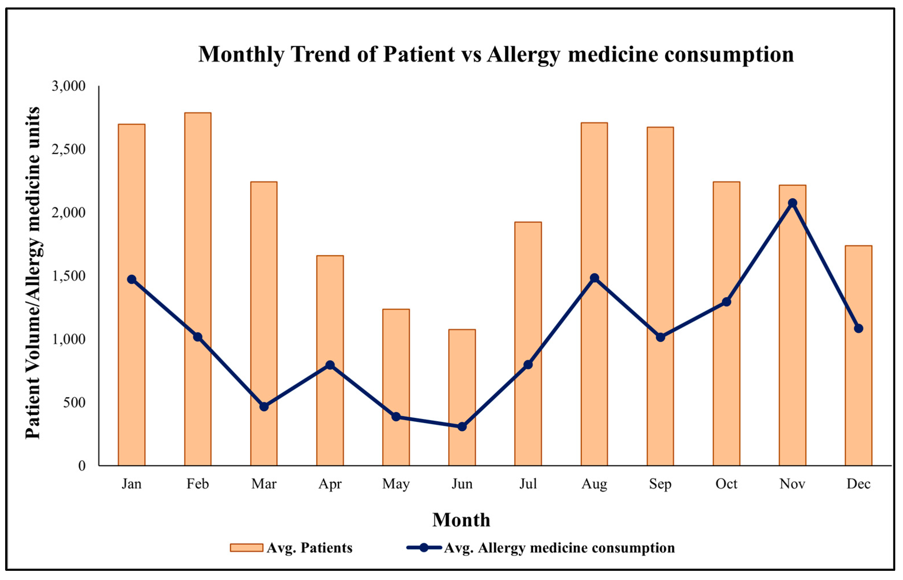 To explore the association between health service utilization and allergy treatment, monthly patient visits (2018–2020) were merged with medicine issuance data for anti-allergy drugs (e.g., Cetirizine, Montelukast). This integrated dataset enabled joint visualization and statistical analysis (see