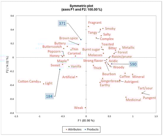 Correspondence analysis using the data from CATA questions on the products and attributes of bigleaf maple syrups in the first two dimensions with axes F1 and F2: 100%.