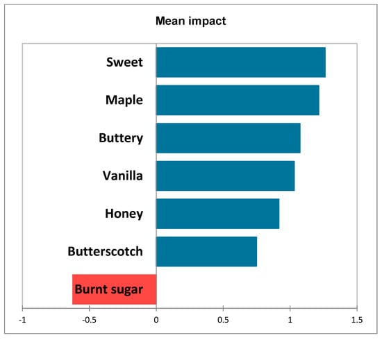 A correspondence analysis (CA) was run on the CATA data (Figure 2). Syrup 184 was most associated with the attributes ‘maple’, ‘vanilla’, ‘sweet’, and ‘light’, while syrup 371 was most related with lighter notes such as ‘honey’, ‘buttery’, and ‘butterscotch’. Finally, the terms ‘molasses’, ‘coffee’, ‘burnt sugar’, ‘strong flavor’, ‘toasted’, ‘bourbon’, ‘bitter’, and ‘woody (pine, resin, cedar)’ were closely related to syrup 590. A principal coordinate analysis of the terms shows those terms that were most associated with the liking of the three products. The syrups that were most well liked exhibited the qualities of ‘maple’, ‘sweet’, ‘vanilla’, and ‘honey’ (Figure 3). According to these chefs, the attributes addressed in the CATA question that had the highest impact on the overall liking mean scores were ‘sweet’, ‘maple’, ‘buttery’, ‘vanilla’, ‘honey’, and ‘butterscotch’ (Figure 4). This is pertinent information for producers as these are the terms that describe the syrups most preferred by these chefs and are well-liked qualities. Less liked were attributes such as ‘burnt sugar’, ‘pungent’, ‘raisin/prune’, ‘strong flavor’, ‘mineral’, or ‘bitter’.