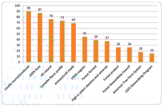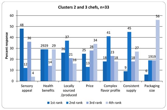 The chefs were most interested in using the product as ‘an ingredient in baked goods’, on breakfast items, ‘as a glaze/marinade’, or ‘as an ingredient in sauces’ (Figure 5). When asked to rank the most important reasons for purchasing bigleaf maple syrup, the group of 29 chefs who were clustered together based on rating all three products highly, felt ‘complex flavor profile’, ‘local production’, and ‘sensory appeal’ were more important that attributes such as ‘price’, ‘health benefits’, ‘consistent supply’, and ‘packaging size’ based on the number one rankings (Figure 6). However, those chefs who liked less some or all of the syrups (clusters 2 and 3) rated ‘sensory appeal’, ‘health benefits’, and ‘locally sourced’ with the most first place rankings; ‘complex flavor profile’ was ranked less important (Figure 7). It is noteworthy that more chefs in cluster 1 ranked ‘complex flavor profile’ first than clusters 2 and 3 combined. This could be a primary driver of liking for chefs or others who are interested in a unique product like bigleaf maple syrup as opposed to sugar maple or maple-flavored products [46]. Additionally, when asked about the most appealing terms used to describe maple syrup, ‘locally sourced/produced’ was chosen by 90% of the chefs tested, followed by ‘100% pure’, which was selected by 87% of those who participated (Figure 8). These findings show the potential for a new product in the maple syrup category for foodservice applications and that high-quality bigleaf maple syrup is a well-liked product of interest in Oregon, USA.