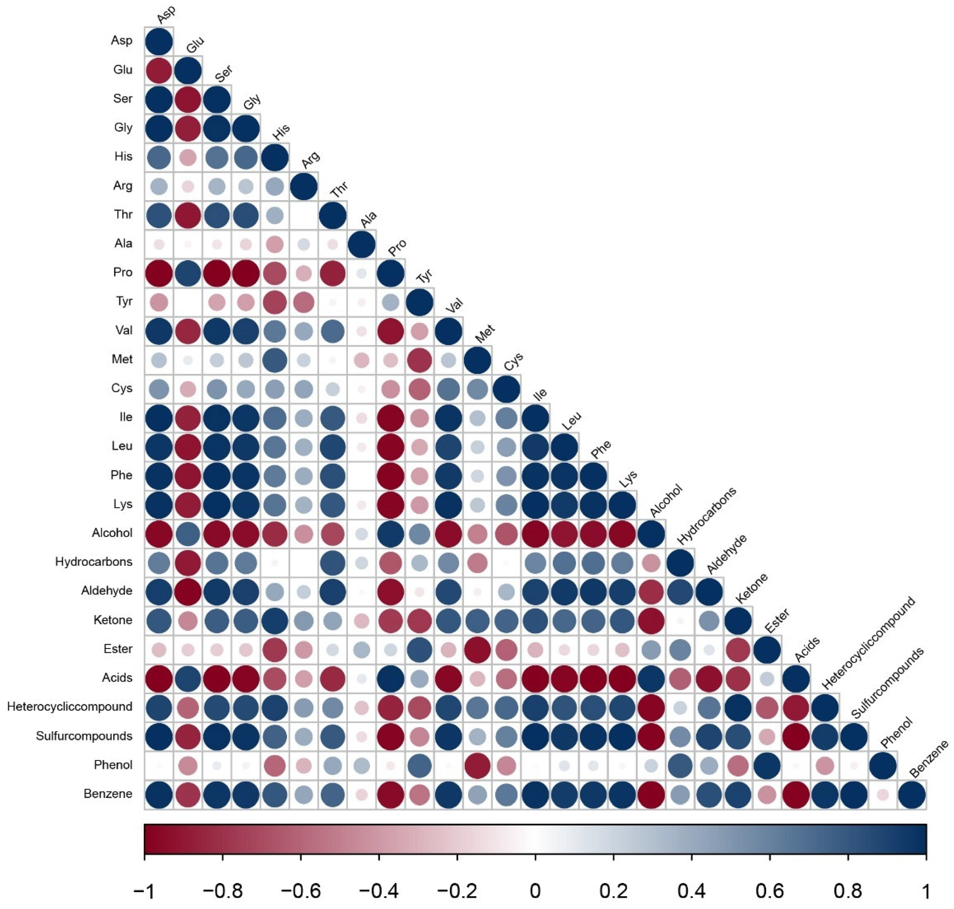 3.4. Correlation of the Predominant Flavor Compounds and Amino Acids