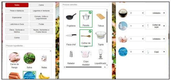 Figure 5. Ingredient and utensil selection interface demonstrating accessible interaction design (labels shown in Portuguese). All usability and accessibility tests were conducted on laptop computers running Windows 11 (Microsoft Corporation, Redmond, WA, USA) using Google Chrome (v120.0, Google LLC, Mountain View, CA, USA).