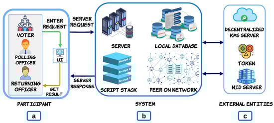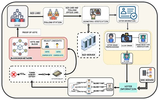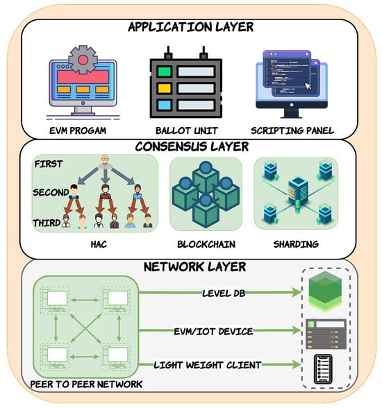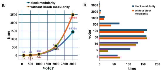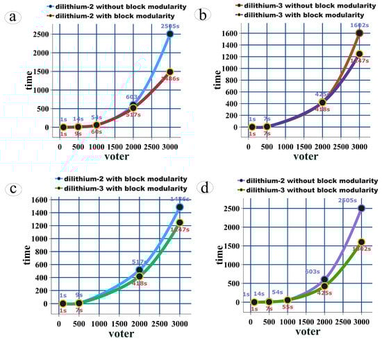 Figure A1 for generating a single block for a single voter. However, as the number of voters increases, the time taken to generate blocks also increases. Interestingly, the red line remains lower than the sky-blue line, which means that Dilithium-2 with block modularity takes less time to generate blocks than Dilithium-2 without block modularity when the number of voters increases.