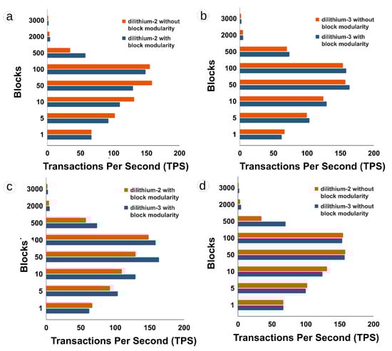 We also analyzed to compare the performance of Dilithium-3 in a blockchain network with and without block modularity, focusing on efficiency and transaction capacity. We represented the results using a line graph shown in