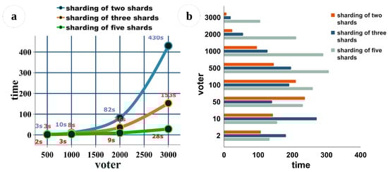 In the line graph, the horizontal axis represents the number of voters and the vertical axis represents the time. For throughput, the horizontal axis represents the time and the vertical axis represents the number of voters.