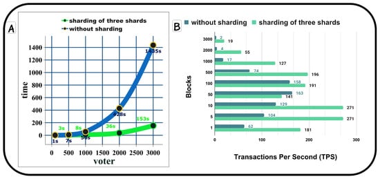 Throughput of Dilithium-3 with block modularity and sharding with two shards. The horizontal axis represents the time, the vertical axis represents voters, and the green line represents sharding, and the sky-blue line represents Dilithium-3 with block modularity. Here, sharding with two shards gave better performance than Dilithium-3 with block modularity.