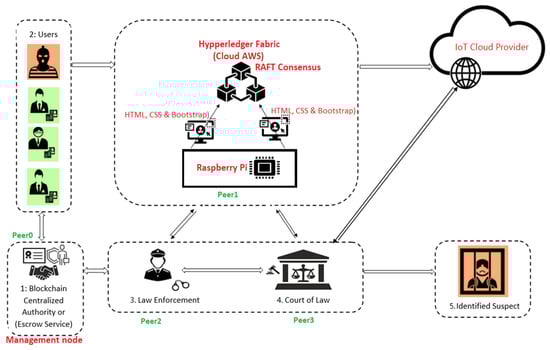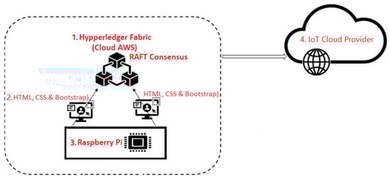 To evaluate the framework performance, the implementation of PBCIS-IoTF was designed and tested on a Hyperledger Fabric platform using RAFT consensus and built on Amazon Web Service (AWS). The front-end web page integration to the blockchain and the Raspberry Pi was designed using Hypertext Markup Language (HTML), Cascading Style Sheets (CSS), Bootstrap, and JavaScript. Figure 2 shows the PBCIS-IoTF framework.
