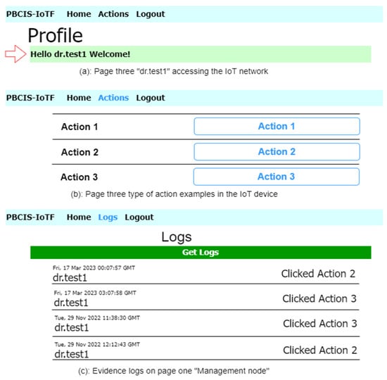 To address the integrity and privacy of the evidence, PBCIS-IoTF compares the SHA-256 recorded hash metadata in the blockchain with all peers to ensure the authenticity and integrity of the recorded evidence being sent from the IoT devices. To address the privacy issues across the network, PBCIS-IoTF will record access to the blockchain and the IoT device “Raspberry Pi” using the staff ID, the type of actions they have interacted with on the IoT devices, the date, and the time of the associated user account. The web page and the blockchain four peers will capture this record data.