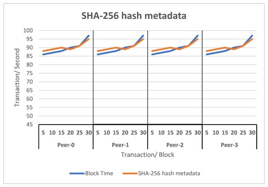 - Comparison analysis of the SHA-256 recorded hash metadata ) in the blockchain of all four peers within the network to ensure the authenticity and integrity of the recorded evidence being sent from the associated IoT device “Raspberry Pi”. Mathematically,where presents the computed hash and is the input data, i.e., evidence metadata. To verify the integrity of the peers, the recorded for all peers should be consistent, i.e.,