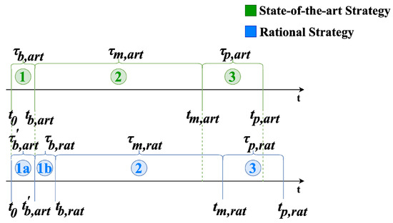 To determine the miner’s block rewarding probability under the rational mining strategy we need to assess whether and how Step 1b affects it. If this is not the case, then . One way to test whether or not Step 1b affects is by fairly comparing the rational with the state-of-the-art mining strategy and looking for reward-related implications. To make the comparison fair, let us consider the following scenarios: (a) The two strategies lead to the same block size; (b) The mining time is the same in the two strategies. It follows that the duration of Steps 2 and 3 is the same in the strategies. Furthermore, we know that the duration of steps 1 and 1a is the same (Section 3.2.2). Under these assumptions, the end consensus time instant of the rational strategy is shifted more to the right with respect to the state-of-the-art strategy’s end consensus time instant . Specifically, it is shifted to the right exactly by a time interval equal to , i.e., by the duration of Step 1b. Therefore, in case of a fork, the block created according to the rational strategy has less chance to end up in the valid consensus chain. This is because, assuming the length of the two chains is the same (fair comparison), miners follow the heuristic of extending the branch with the block they heard first. This means that Step 1b has actually reward-related implications. Figure 3 depicts the described scenario.