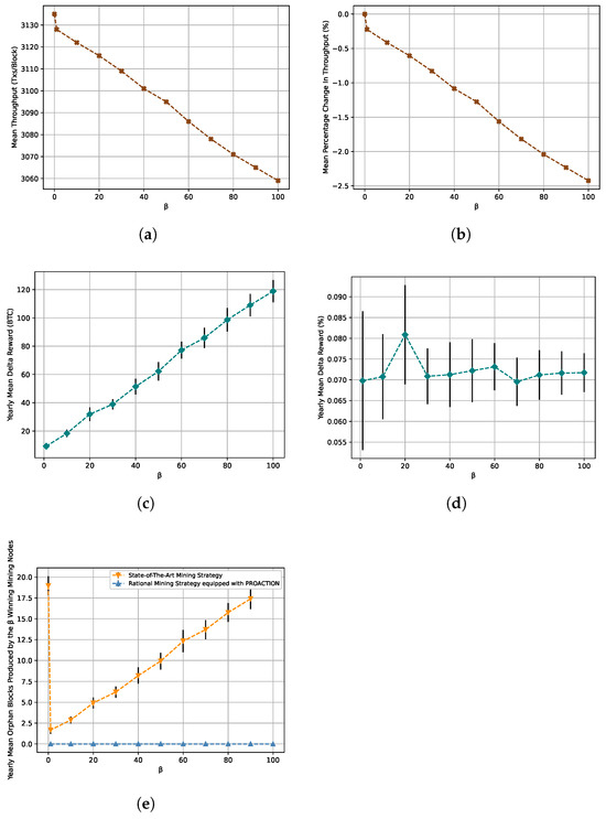 Simulation results as a function of the percentage of winning mining nodes () employing the rational mining strategy powered by PROACTION vs. the same percentage () and those same winning mining nodes following the state-of-the-art mining strategy in the context of the Bitcoin protocol. (a) Mean network throughput. (b) Mean percentage change in throughput. (c) Yearly mean reward gain. (d) Yearly percentage mean reward gauin. (e) Yearly mean prphan blocks produced by winning miners.