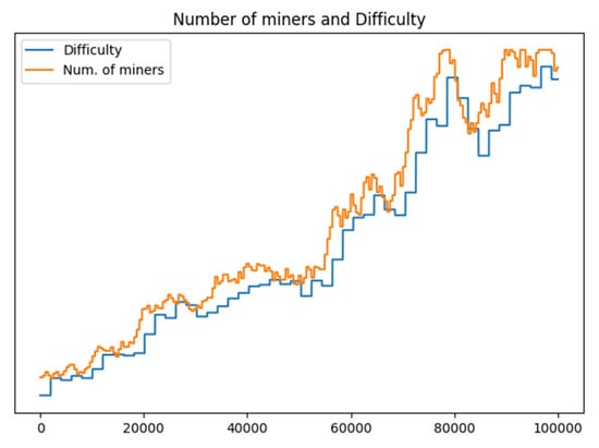 Figure 5 shows how Difficulty Regulation impacts Blockchain evolution for an increasing number of Miners and consequently of . More specifically, it shows the evolution of Difficulty, driven by Regulation, due to the evolution of the number of Miners, which the BEE receives as an input using the hot reconfiguration capability. The chart shows that the growth of Difficulty, driven by regulation, proceeds in steps, where each step represents a sequence of 2016 VBs at constant Difficulty (again using Bitcoin as a reference). It is therefore at every Difficulty adjustment that GD-VP comes into play. When detecting a Difficulty change, a Miner updates its next publication deadline.