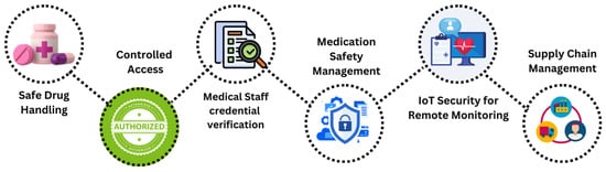 Key areas where blockchain enhances healthcare systems, such as drug safety, secure access to sensitive data, verification of medical staff credentials, protection of remote IoT-based monitoring, and improved transparency and coordination in supply chain operations.