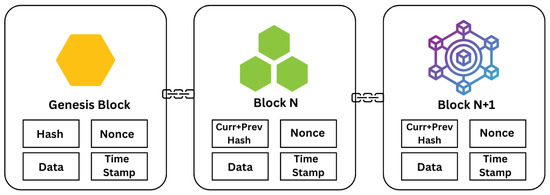 Blockchain technology, which provides decentralized, tamper-resistant data management, has become a revolutionary technology to address these issues. The decentralized architecture and immutability of blockchain technology have the potential to improve traceability, transparency, and trust in the sharing of medical data. The blockchain is made up of numerous pieces that are chronologically connected. Figure 2 shows a block that is made up of four parts: data, the hash of the current block, and the hash of the block before it, nonce and timestamp. The genesis block will be the first block made, and every subsequent block will include its own contents and hash while keeping the hash of the previous block. The role of blockchain in protecting healthcare data has been investigated by researchers; however, there are significant obstacles to its implementation, such as scalability bottlenecks [], integration issues with real-time medical devices [], and worries about centralized control [,]. Data integrity may be compromised by security flaws in blockchain systems [], and adhering to privacy regulations in the healthcare industry makes adoption of blockchain much more difficult [,]. However, blockchain is still a key technology for creating distributed, safe healthcare systems, particularly when combined with other complementing technologies.