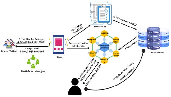 Figure 3 illustrates the decentralized workflow for securely requesting and verifying patient data within the proposed healthcare system. In this framework, users (doctors/patients) first register through a decentralized application, where multi-group managers oversee the registration process and provide each user with unique identification credentials for authentication. Patient data is encrypted and uploaded to a hospital-managed electronic health record (EHR) server, ensuring sensitive information remains protected at the source.