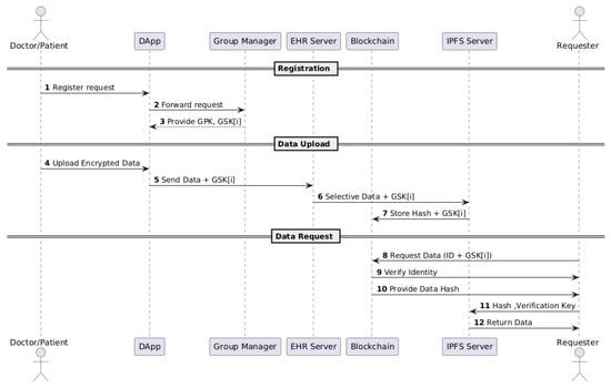 Sequence diagram of the proposed blockchain- and IPFS-enabled framework for decentralized electronic health record (EHR) management. The diagram illustrates the complete workflow, including the registration phase, the data upload phase, and the data retrieval phase.