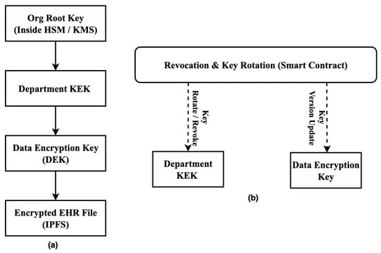 Key management and revocation workflow. (a) illustrates the hierarchical encryption model where the organizational root key secures departmental KEKs, which wrap DEKs used to protect EHRs stored in IPFS. (b) shows the on-chain smart contract responsible for key rotation and revocation, enabling immediate blocking of compromised credentials and controlled key version updates without re-encrypting the entire dataset.