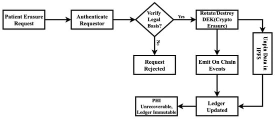 Workflow of the GDPR-compliant patient data erasure process in a blockchain-integrated EHR system. The workflow ensures authenticated erasure requests, crypto-erasure of Data Encryption Keys (DEKs), unpinning of data in IPFS, and immutable ledger updates.