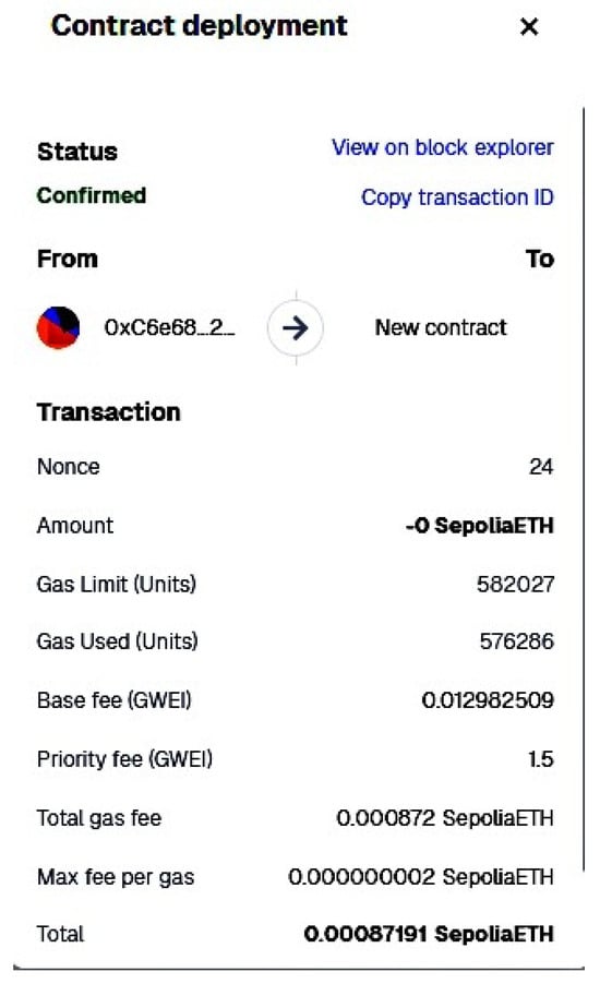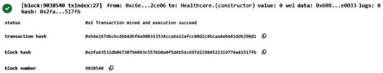 After confirming the transaction in MetaMask, a healthcare contract will be generated, as depicted in Figure 8. After confirmation of the transaction, its data will be added to the Ethereum platform, including details such as the transaction hash, transaction fee, and other relevant information shown in Figure 9.