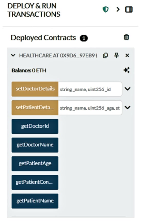 Interface of the deployed “Healthcare” Solidity smart contract on the Ethereum blockchain prior to data entry. The contract defines the “Patient” and “Doctor” structs and includes functions to set and retrieve patient and physician information, illustrating the structure of a blockchain-based system for secure healthcare data management.