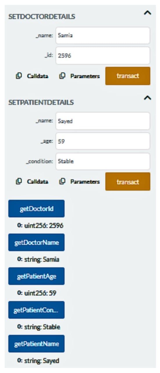 With the help of the given Solidity smart contract, "Healthcare," patient and physician data can be managed on an Ethereum blockchain healthcare system. As seen in Figure 10, it constructs two primary structs, "Patient" and "Doctor," to hold data such the patient’s name, age, health status, and the doctor’s name and ID. Functions to set and retrieve these details for physicians and patients are included in the contract. As seen in Figure 11, these features enable the safe archiving and retrieval of healthcare-related data on the blockchain, promoting openness and accessibility in healthcare administration.