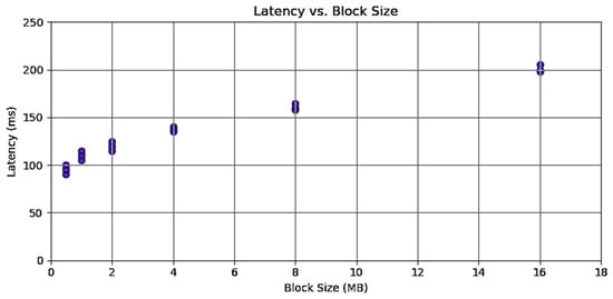 To assess the performance of the proposed system, key factors such as latency and throughput were evaluated under varying conditions. Figure 12 demonstrates the scalability and robustness of the proposed approach with respect to changes in block size. The X-axis represents the block size (in MB), while the Y-axis denotes the latency (in milliseconds). While an increase in latency is observed as the block size grows, the rate of increase remains controlled and linear, with latency values ranging from approximately 90 ms to 200 ms as the block size expands from 0.5 MB to 16 MB. This trend reflects the system’s optimized architecture, which effectively mitigates latency overhead despite larger data transmissions. These results support the proposed system’s ability to maintain a favorable throughput-latency balance under diverse workload conditions, making it well-suited for healthcare applications that demand timely access to large patient records, medical imaging data, and secure health information exchanges.