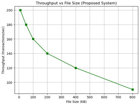 Impact of file size on throughput in the proposed system. Throughput decreases as file size increases from 10 KB to 800 KB. The decline is steeper at smaller file sizes and gradually levels off, indicating increased processing overhead for larger files.