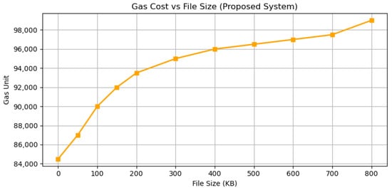 Along with the throughput and latency results, the gas cost graph shows that the system stays efficient and scalable even as file sizes increase. Figure 14 illustrates the relationship between file size (X-axis, in kilobytes) and gas cost (Y-axis, in gas units) within the proposed healthcare system. As the file size increases from 10 KB to 800 KB, the gas cost also rises gradually. This is because larger files require more metadata, such as encrypted hashes and access keys, to be securely processed and recorded on the blockchain. Although the actual patient data is stored off-chain on IPFS and in hospital EHR systems, the blockchain still handles critical operations like access control, authentication, and data verification. These processes become slightly more complex with increasing file size, leading to a controlled and linear increase in gas usage. However, in healthcare applications, this trade-off is acceptable, as ensuring the privacy, security, and integrity of sensitive patient information is far more important than minimizing gas costs. The graph thus demonstrates the system’s ability to scale efficiently while upholding strict healthcare data protection standards.