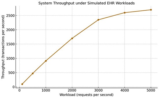 System throughput under simulated EHR workloads inspired by MIMIC-III. The framework scales nearly linearly up to 3000 requests/s before flattening at 2700 tps under 5000 requests/s. Latency increases due to consensus delays and IPFS retrieval overhead, while success rate remains above 92 percent.