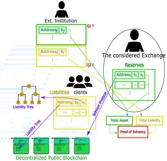 In essence, cryptocurrency reserves come from addresses stored on the blockchain and owned by the exchange. This means that, for such a UTXO related to the address (i is the index identity of the considered address), the exchange possesses the private key (see the top green block in the blue ‘Exchange’ box on the top of Figure 1).