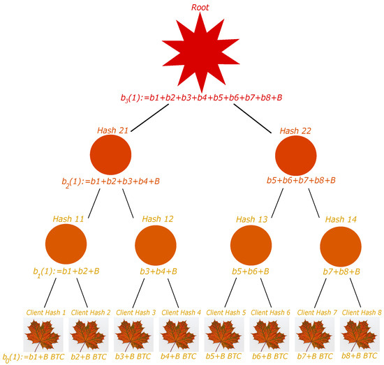 We suppose we have a number of clients which is a power of 2. The exchange may create the tree as follows; see Figure 3. First, each account is organized as a leaf of a binary tree. To each leaf, we associate its hash given by , with the associated balance (and not only ). Then, each odd-ranked leaf has its hash, concatenated with the next even-ranked leaf’s, and the whole obtained vector is hashed once more. The account balance associated with this parent node is the sum of its children balance, minus B. The process is repeated again until reaching the root of the binary tree. It turns out that the balance associated with the root represents all the liabilities the exchange owes to its clients and external exchanges.