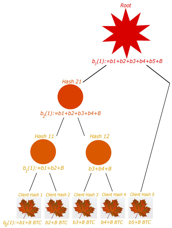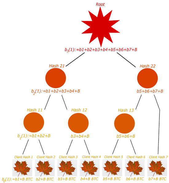 To elaborate more on the associated balances, the balance of a parent node is not given only by the sum of balances of its two children, but we now require the balance to be . In this case, it can easily be proven that the balance associated with the liability root is the exchange total liability. Indeed, two brother leaves have balance and , where and are the balances of the two considered clients. The parent node therefore has balance . This easily generalizes to each floor. Thus, the last floor balance is , which is the exchange total liability.