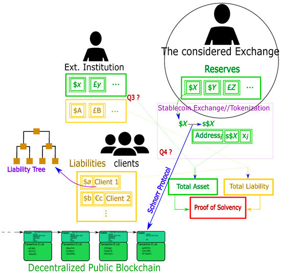 General solvency protocol for the crypto environment. The considered institution is in a center of a market (right-hand-side in the figure) within its clients and external liquidity providers (both left-hand-side). The considered institution has reserves (green) in UTXOs and they own the private keys ’s, allowing them proving reserves through a Schnorr protocol, given the fact that the underlying blockchain is public. The institution also has reserves elsewhere, raising question Q1 (see text). In addition, the considered institution has liabilities (yellow) regarding their clients, and it possesses the private keys. Running the Liability Tree (see Section 2.7) is a possibility to allow the clients to check that the institution does have their money. The considered institution also has liabilities to external liquidity providers, leading to question Q2.