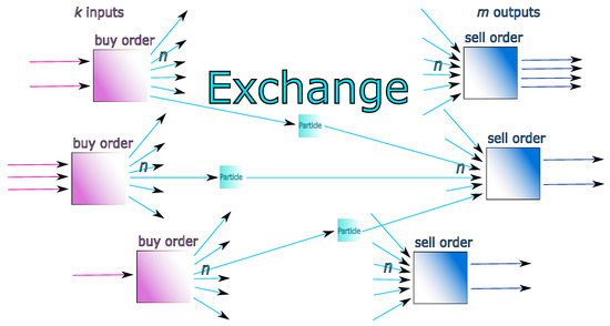 Illustration of a sets of inputs and outputs interacting with the exchange. There are buy-order transactions (left-hand side, purple boxes) having in total k inputs, and sell-order transactions (right-hand side, blue boxes) having in total m outputs. We suppose, to simplify, that there are systematically n particles involved for explosions and implosions. We are able to derive a fair price-optimal calibrated strategy (source of the figure: [7]).