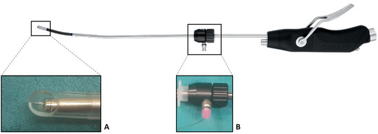 The C-MAC video stylet is shown, of which two areas (A,B) are enlarged. (A): the bevel of the tracheal tube and the tip of the epidural catheter are placed a few millimeters distal to the deflectable tip of the C-MAC video stylet. This way, they both remain visible through the camera of the video stylet but at the same time do not dazzle the anesthesiologist’s sight completely. Also, this allows direct vision of where the “spray-as-you-go” pattern will distribute its local anesthetic. (B): the “ET Tube Holder” is shown on the left-hand side, connected to the tracheal tube, and its attachment to the tracheal tube can be secured by the wheel shown on the right-hand side. Furthermore, the epidural catheter is progressed through the oxygenation port, and in this case, it is attached by its included cap (pink), although a small tape holds it better in place according to our experiences.