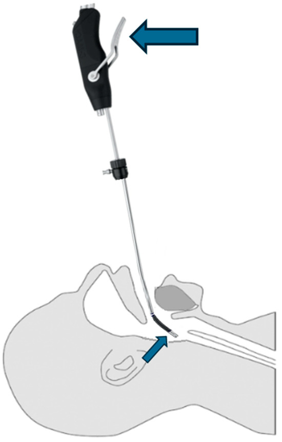 At the start of the procedure, the patient was optimally positioned in a supine position, head up, and connected to the monitor to assess vital signs. Oxygenation was performed by means of a nasal cannula with five liters of oxygen per minute. After an initial bolus of 3 mg midazolam IV, the Trachospray device was used for topicalization of the upper airway [4]. The Trachospray device, which is placed between the lips of the patient, delivers a fine mist spray. The droplet size created by the Trachospray is designed for maximum coverage of the hypopharynx, tongue, epiglottis and larynx, with only minimal lung deposition. An in vitro study showed that the coverage of this area with the Trachospray was substantially superior to a jet nebulizer and a lidocaine spray pump [4]. In this case, 4 mL of lidocaine 5% was administered through the Trachospray during inhalation. Then, continuous infusions of remimazolam (0.5 mg/kg/h) and remifentanil (0.042 µg/kg/min) were administered. This resulted in an adequate depth of sedation (i.e., “−4 Deep Sedation” according to the Richmond Agitation Sedation Scale (RASS); no response to voice, but movement or eye-opening to physical stimulation). The patient remained spontaneously breathing with an unassisted open airway.