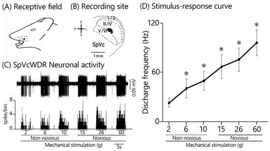 The response of extracellular single-unit SpVc WDR activity to mechanical stimulation of the whisker pad, was examined using a series of procedures. To avoid sensitization of peripheral mechanoreceptors, a paint brush was quickly used as a search stimulus to identify the approximate area of the receptive field on the left side of the whisker pad. Subsequently, single units responding to a series of von Frey hairs were investigated on the left side of the whisker pad (Semmes–Weinstein Monofilaments, North Coast Medical, Morgan Hill, CA, USA) with non-noxious (2, 6, and 10 g) and noxious (15, 26, and 60 g) mechanical stimulation for 5 s at intervals of 5 s [19,20]. In this study, we identified the criteria for WDR neurons as follows: graded non-noxious and noxious mechanical stimulation applied to the receptive field produces an increased firing frequency in proportion to stimulus intensity. Following the identification of nociceptive SpVc WDR neurons that respond to the whisker pad, we measured the threshold for mechanical stimulation and the size of the receptive field. The mechanical receptive field of neurons was identified by applying von Frey hairs to the facial skin, and then traced onto a life-sized illustration of the face [19,20].
