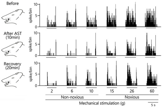 Previous research has shown that WDR neurons in the SpVc area are crucial in the mechanism responsible for hyperalgesia and referred pain associated with orofacial pain [1,4,5]. The main objective of the current research was to analyze the impact of AST on nociceptive SpVc WDR neuronal functions, without considering NS neurons. Post-stimulus histograms (bin = 100 ms) were generated for each stimulus. The impact of administering AST intravenously (0.2 mL of 1 mM and 5 mM) using a Hamilton microsyringe (Sigma-Aldrich, Milano, Italy), was assessed and evaluated 5, 10, 15, 20, 25, and 30 min after administration because the peak effect and recovery were thought to occur within this timeframe. AST was dissolved in dimethyl sulfoxide to obtain a 10 mM stock solution. The stock solution was stored at −20 °C until use. The stock solution was immediately diluted to the required concentration using saline before use. The average spontaneous and mechanically evoked discharge rates, as well as the mechanical threshold, were measured before and after intravenous injection of AST and were analyzed in the present study. The positions of the individual unit recordings within the SpVc region were determined using the micromanipulator, measuring the distance from the obex along the medial-lateral axis and surface of the medullary dorsal horn, with reference to the rat brain atlas, as described in our previous studies [18,19,20].