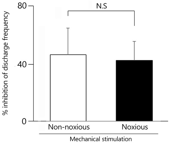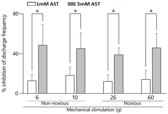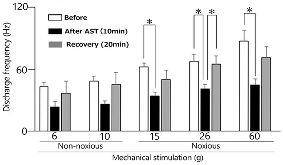 We evaluated how 10 mM intravenous administration of AST affects responses to both non-noxious and noxious stimuli. As shown in Figure 5, there was no noticeable difference in the average inhibition discharge frequency caused by non-noxious and noxious stimuli.