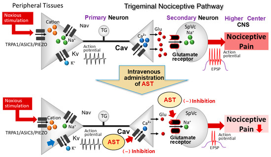 The present study provides the first evidence that, in the absence of inflammatory or neuropathic pain, acute intravenous administration of AST produces a shot-term inhibition of trigeminal sensory transmission, including nociception, possibly by inhibiting Cav channels and excitatory glutamate neuronal transmission (Figure 6). Although further studies are needed to elucidate this mechanism, AST may be considered a potential therapeutic agent for the treatment of trigeminal nociceptive pain without side effects.