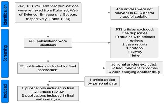 A total of 1000 articles were retrieved from the database search. A flowchart following PRISMA guidelines is presented in Figure 1. Of the 1000 articles, 514 were duplicates, leaving 586 potentially relevant studies for analysis. After screening titles and abstracts, 433 studies were excluded, resulting in 53 articles selected for full-text review. Among these, 37 addressed the topic of interest but focused on different stages or outcomes unrelated to CCS or electrophysiological parameters. Additionally, 6 studies evaluated anesthetic agents other than propofol. One study obtained from personal data was also included.