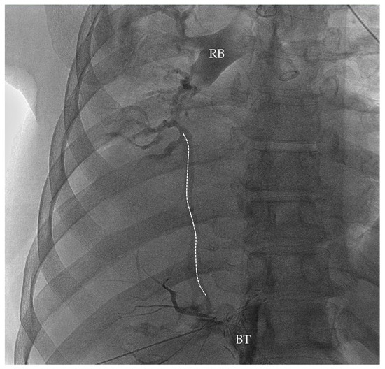 AP contrast fluoroscopy demonstrating BBF post-intubation with DLT in the IR suite. The dashed line tracks the fistula between the biliary tree and the right airway. Contrast clearly demonstrates a tract between the biliary tree and the right bronchus through the BBF. RB = right bronchus; BT = biliary tree.